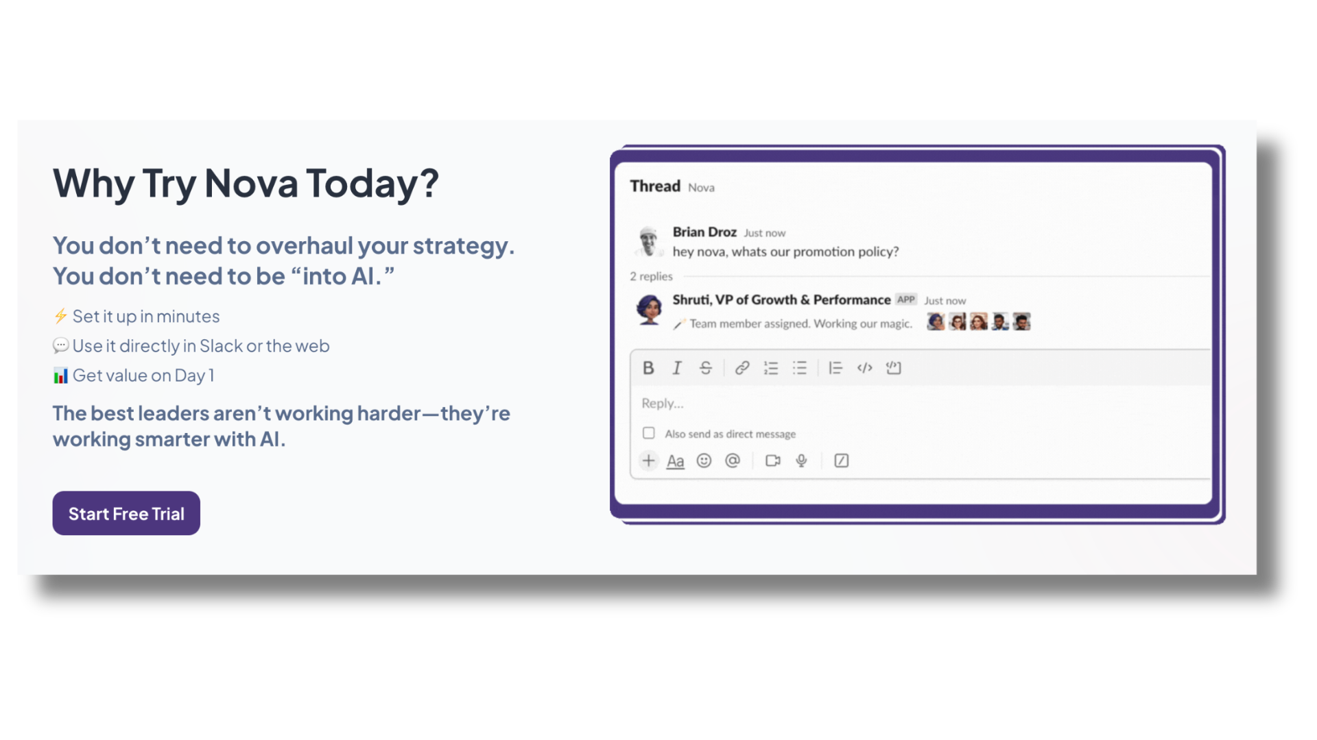The result is a more empowered, responsive form of management.Nova gives every leader, regardless of background or bandwidth, the ability to guide their teams with context, empathy, and precision. It transforms leadership from reactive to proactive and ensures alignment happens continuously.