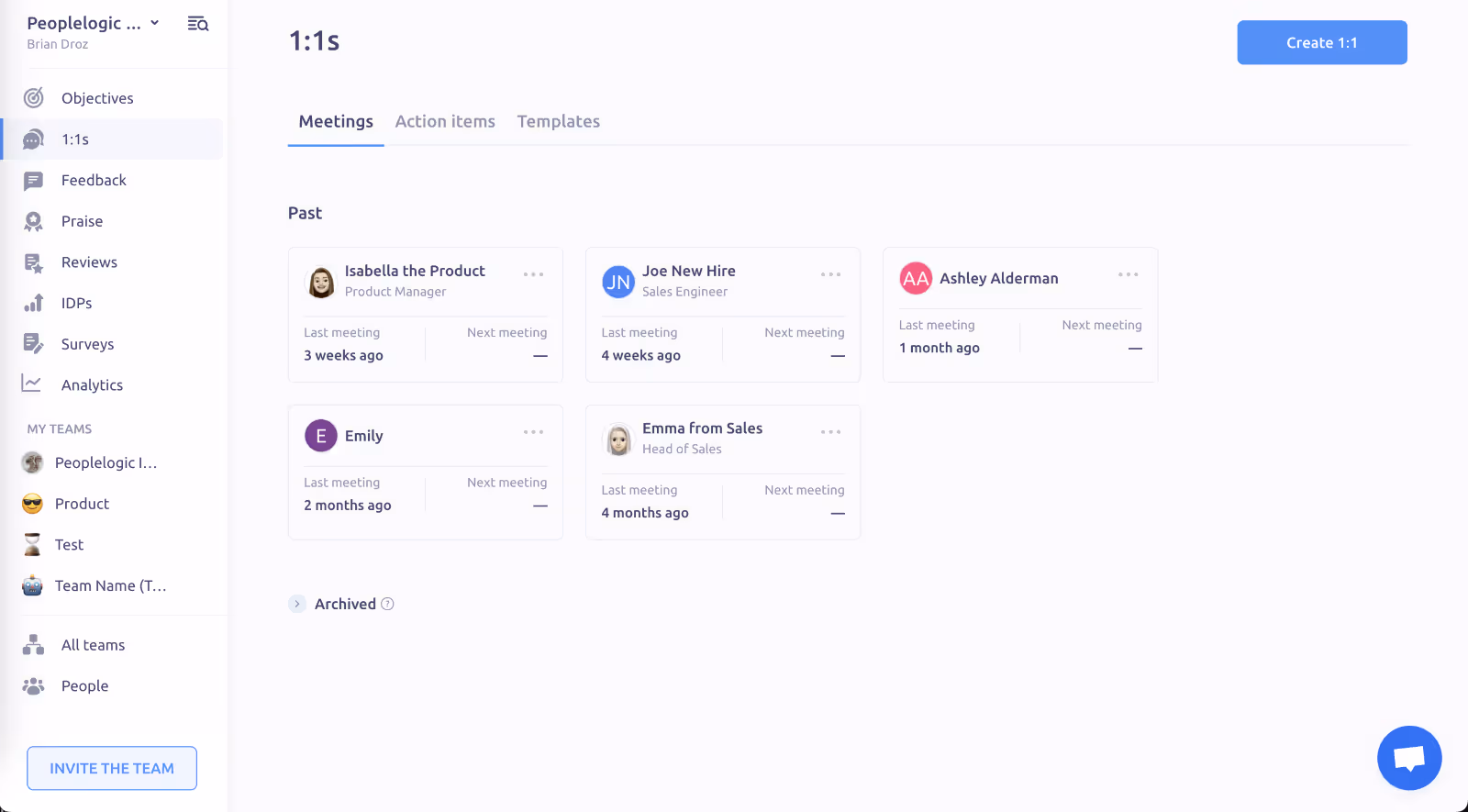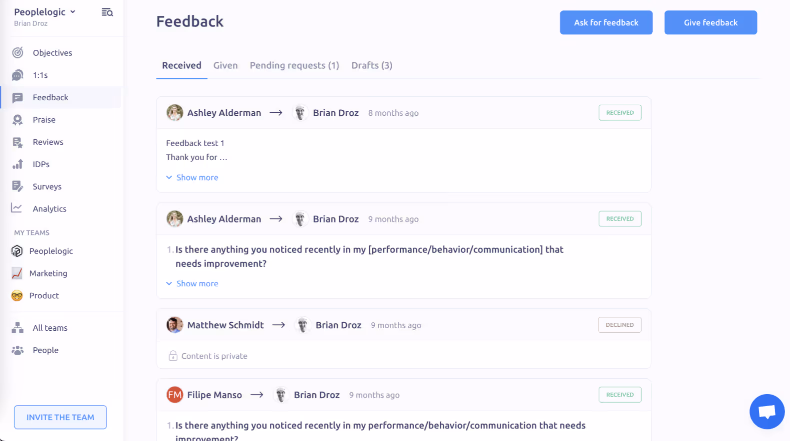 Real-Time Feedback: Immediate, constructive feedback is crucial for employee growth. Real-time feedback allows employees to understand their strengths and areas for improvement promptly, rather than waiting for a scheduled review. Documented feedback in the Peoplelogic platform is also available for reference in Reviews, Â 1:1s, and soon IDPs.